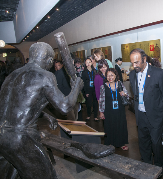 從一進(jìn)中國(guó)火腿博覽館的大門(mén)開(kāi)始,使節(jié)們就被眼前精美的浮雕所吸引。透過(guò)金字火腿吳月肖副總經(jīng)理有趣的解說(shuō)和翻譯的詳盡翻譯,50余人才搞明白:原來(lái)這就是著名的《百姓勞軍圖》,而使節(jié)中的一些“中國(guó)通”發(fā)現(xiàn)他們熟知岳飛的師傅宗澤,原來(lái)竟然是金華火腿的祖師爺,火腿原料金華兩頭烏如此有趣珍貴,就好比中國(guó)的熊貓。